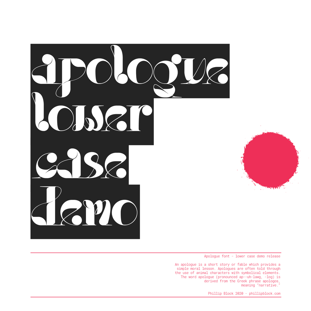 Apologue, my 1970's-meets-art-nouveau display font, the lower case set with ligatures and basic punctuation is available now.